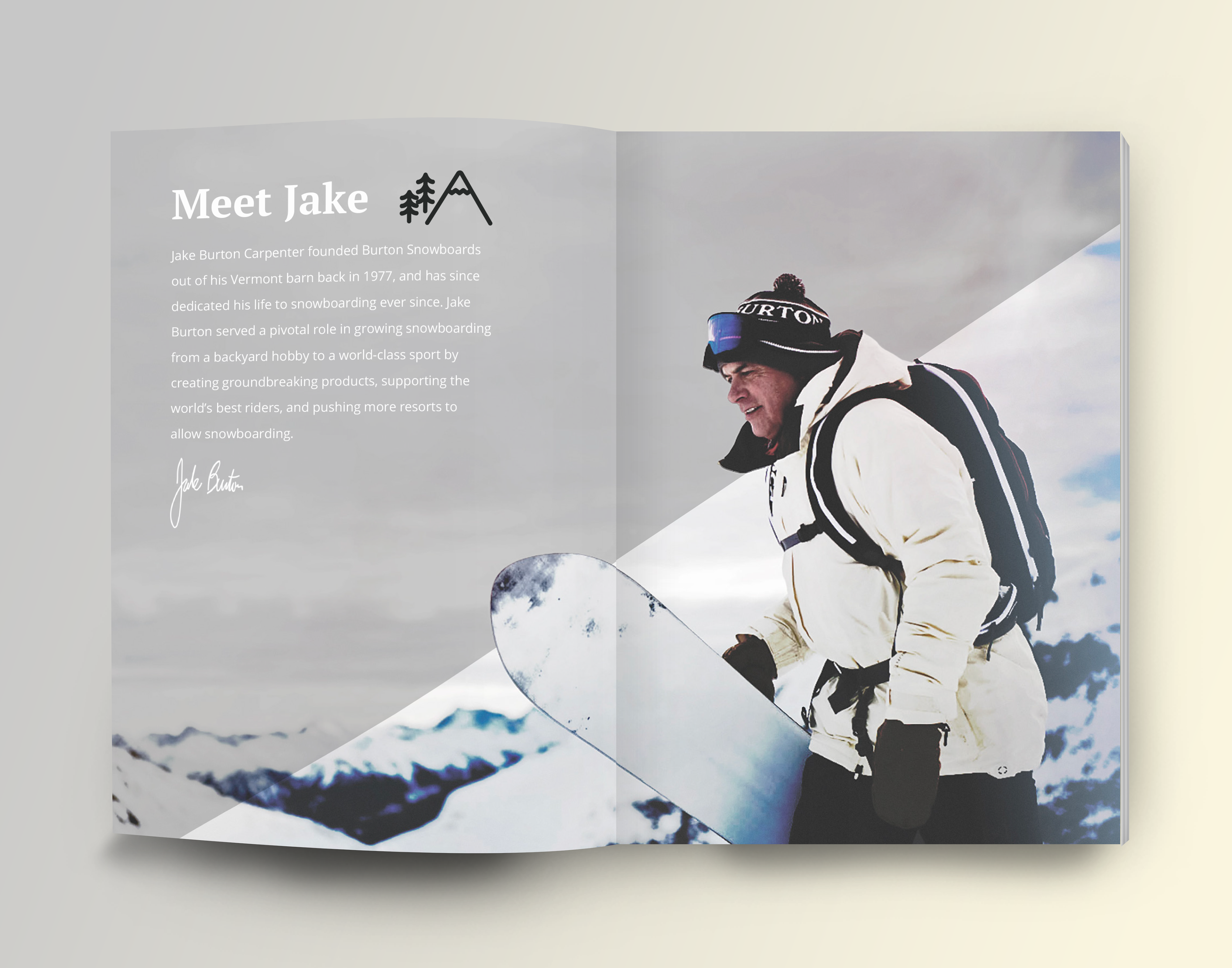 BURTON IS A SNOWBOARD & WINTER APPAREL COMPANY CHARACTERIZED BY IT’S ATTENTION TO DETAIL AS WELL AS SUSTAINABILITY. TO EXPRESS THESE INSIGHTS I DESIGNED A MAGAZINE SPREAD THAT INCORPORATES THE BRAND’S HISTORY AND VALUES, AS WELL AS A PROMOTION OF THE 2019 SNOWBOARD COLLECTION.
